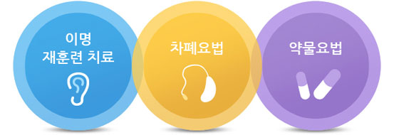 이명의 치료방법으로는 환자가 이명을 별 의미 없는 신호로 약하게 인식하도록 습관화하게 하는 이명 재훈련 치료(Tinnitus Retraining Therapy, TRT), 보청기나 이명차폐기 등의 보조기기를 통해 주변소리를 들려주어 이명을 느끼지 않게 하는 차폐요법, 이명을 경감 시키거나 이명에 따른 우울, 불안증세를 도와주는 약물요법이 있습니다.
